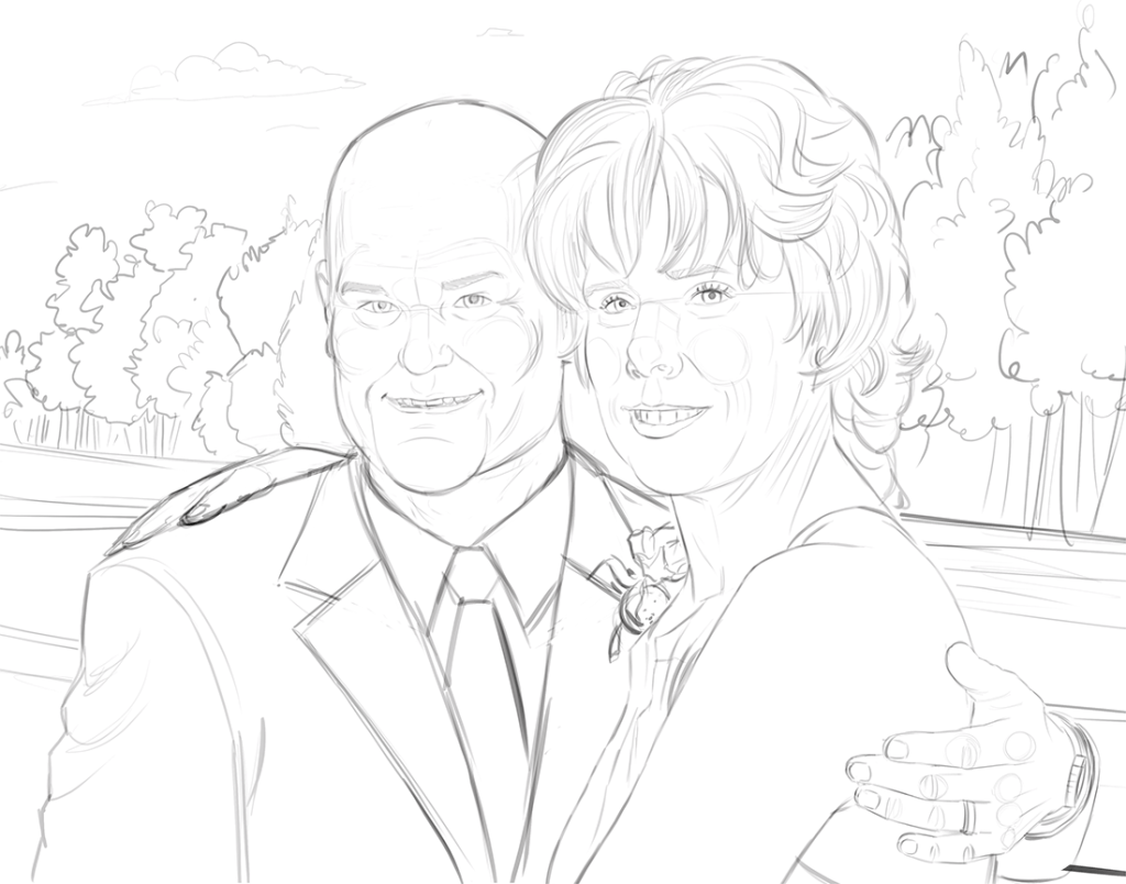 After discussing his ideas, I sketched out a new mock up that matched Steve’s requirements. I wanted to ensure that the portrait reflected their love. I also aimed to capture the essence of the moment they were celebrating. To enhance the overall composition, I arranged the golf course in the background, which holds significance meaning for Steve.